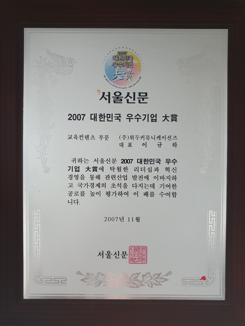 2007 대한민국 우수기업 대상 페이지 정보 작성자 WeDu 댓글 0건 조회 5,930회 작성일 19-05-30 19:31 본문 2007-11-00 대상 교육 콘텐츠 부문 2007 대한민국 우수기업 대상 서울신문 List Previous제 8회 디지털 이노베이션 대상 19.05.30
