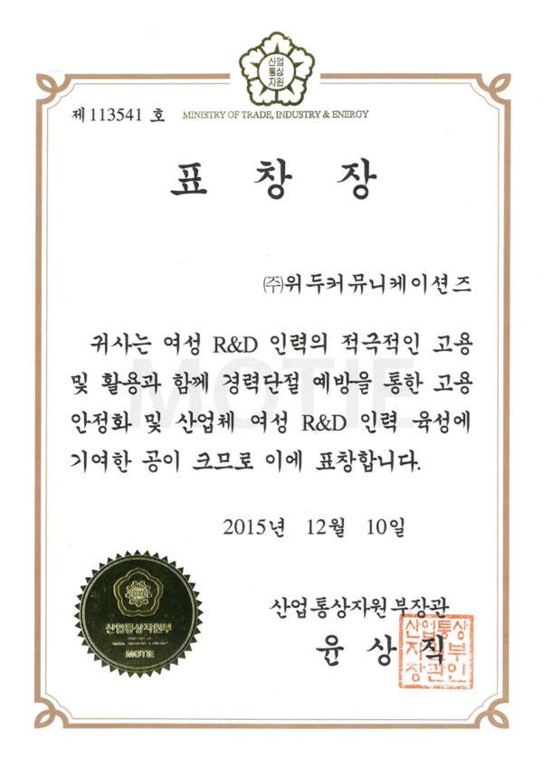 산업통상자원부 표창장 페이지 정보 작성자 WeDu 댓글 0건 조회 6,260회 작성일 19-05-30 19:34 본문 2015-12-10 표창장 제 113541호 여성 R&D 인력 고용 산업통상자원부장관 윤상직 List Previous서울클러스터 어워드 우수상 19.05.30 Next감사장 제 143호 19.05.30