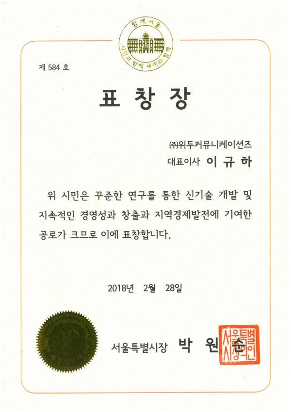 서울특별시장 표창장 페이지 정보 작성자 WeDu 댓글 0건 조회 6,784회 작성일 19-05-30 19:35 본문 2018-02-28 표창장 제 584호 신기술 개발 및 지속적인 경영성 창출, 지역 경제 발전 기여 서울특별시장 박원순 List Previous2018 소년한국 우수 어린이 도서 19.05.30 Next서울클러스터 어워드 우수상 19.05.30