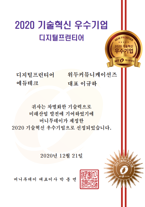 2020 기술혁신 우수기업 페이지 정보 작성자 WeDu 댓글 0건 조회 6,238회 작성일 21-12-31 12:58 본문 2020-12-21 2020 기술혁신 우수기업 디지털프런티어 에듀테크 머니투데이 대표이사 List Previous2020 소년한국 우수 어린이 도서 선정 21.12.31 Next2020 서울산업진흥원 2020 DMC어워드 21.12.31