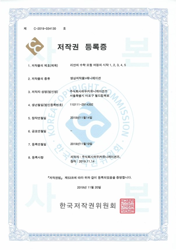 [한국/저작권] 리안의 수학 모험 여정의 시작 1,2,3,4,5 페이지 정보 작성자 WeDu 댓글 0건 조회 5,993회 작성일 21-12-31 12:36 본문 2019-11-20 저작권 C-2019-034130 영상저작물>애니메이션 List Previous[한국/저작권] OLL KIDS/MATH 21.12.31 Next[한국/저작권] 리안의 수학 모험 애니메이션 OST 19.11.25