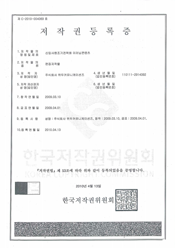 [한국/저작권] 신입사원조기전력화 이러닝 콘텐츠 페이지 정보 작성자 WeDu 댓글 0건 조회 6,163회 작성일 19-05-30 19:01 본문 2010-04-13 저작권 C-2010-004069 신입사원조기전력화 이러닝콘텐츠 / 편집저작물 List Previous[한국/저작권] 리안의 수학 모험 19.05.30 Next[한국/상표] OLL 41류 19.05.30
